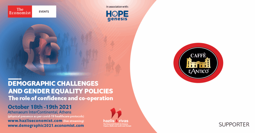 O CAFFÈ L’ANTICO συμμετείχε ως χορηγός στο συνέδριο του Economist «Δημογραφικές Προκλήσεις και Πολιτική για την Ισότητα των Φύλων» που πραγματοποιήθηκε στις 18-19 Οκτωβρίου 2021 στο ξενοδοχείο Αθήναιον Ιντερκοντινένταλ υπό την αιγίδα του Υπουργείου Εργασίας και Κοινωνικών Υποθέσεων, σε συνεργασία με τη HOPEgenesis και με την υποστήριξη του Γραφείου του Ευρωπαϊκού Κοινοβουλίου στην Ελλάδα και της Αντιπροσωπείας της Ευρωπαϊκής Επιτροπής στην Ελλάδα.