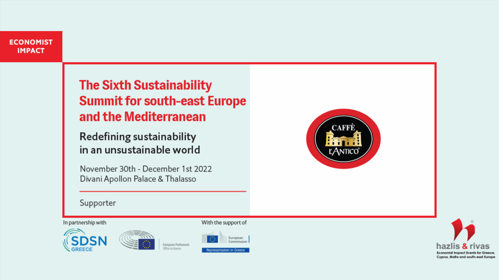 O CAFFÈ L’ANTICO συμμετείχε ως χορηγός στο “6th Sustainability Summit for SE Europe & The Mediterranean του Economist” που διεξήχθη την 30ή Νοεμβρίου και 1η Δεκεμβρίου 2022 στο ξενοδοχείο Divani Apollon Palace. Το συνέδριο πραγματοποιήθηκε υπό την αιγίδα της Α.Ε. της Προέδρου της Δημοκρατίας Κατερίνας Σακελλαροπούλου, διοργανώθηκε σε συνεργασία με το SDSN Greece και με τη στήριξη του Γραφείου του Ευρωπαϊκού Κοινοβουλίου στην Ελλάδα και της Αντιπροσωπείας της Ευρωπαϊκής Επιτροπής στην Ελλάδα.
